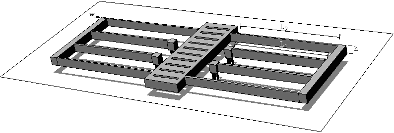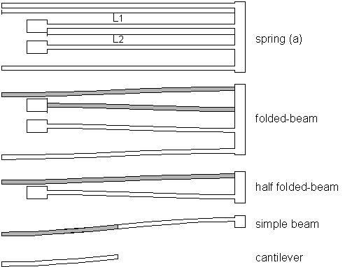 Example 1: with a suspension of type (a) and L1=240 µm, L2=300 µm, h=2 µm, w=2 µm, E=170 GPa (polysilicon) we find k = 0.266 N/m.