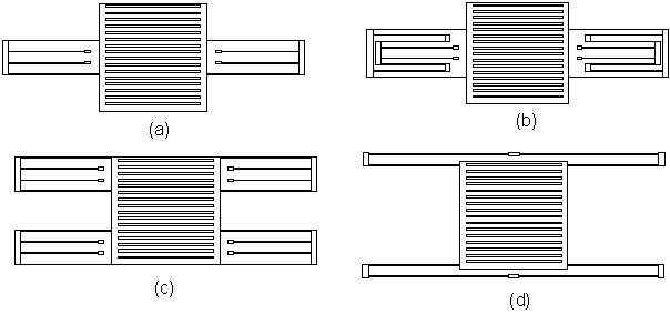 All the suspensions shown above are obviously folded beams that could be easily decomposed in a set of simple beam placed either in series or in parallel. An interesting point to consider is that all the simple-beam ends move parallel to the X-axis without rotation. Thus it is possible to decompose further the simple beam in two cantilevers in series. This simple consideration is shown in Figure 3.